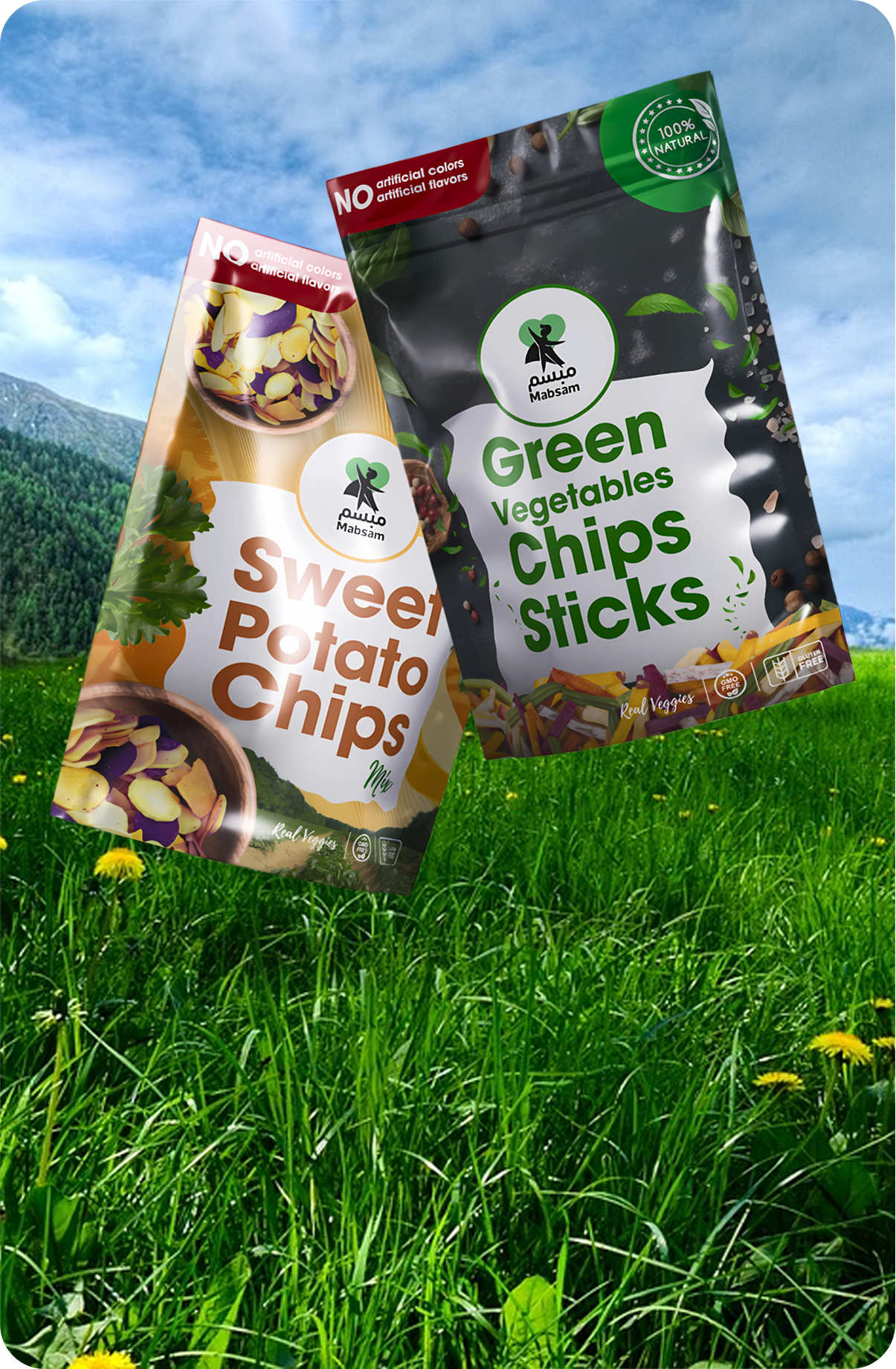 تغليف مصمم بعناية يعكس هوية Mabsam وجودة شرائح الخضار الصحية، بتصميم أنيق وبسيط يبرز طبيعة المنتج ويمنح تجربة فتح جذابة ومريحة.